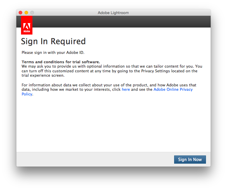 Adobe Photoshop Lightroom is the cloud-based service that gives you everything you need to edit, organize, store, and share your photos across any device. Here's how to get a 7-day free trial of Lightroom. Click the Start Free Trial button. Sign in or set up your Adobe ID and download your free trial. How to sign in to your Adobe account Sign in at https://account.adobe.com with your email address and password. If you created your Adobe account using your social account, use your Facebook, Google, or Apple account to sign in. Make sure you sign in with the same account you originally signed up with.